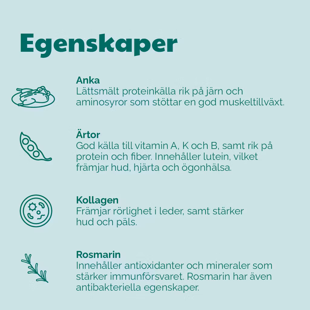 Innehåll: ankprotein 30%, gula ärtoe, flytande grönsaksstärkelse, hydrolyserat kycklingprotein, kollagen, kycklingleversås