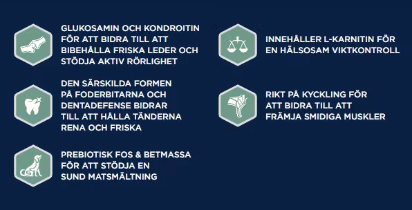 - Särskild form på foderbitarna och unik DentaDefense-teknik bidrar till att hålla tänderna rena och friska