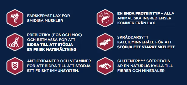 - En enda proteintyp – alla animaliska ingredienser kommer från lax