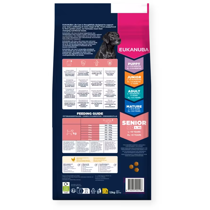 EUKANUBA Life Care erbjuder vetenskapsbaserad premiumnäring som är noggrant utformad för att möta hundens föränderliga behov genom varje livsfas. Detta torrfoder är rikt på färsk kyckling är speciellt formulerat för stora äldre hundar från 9 år och uppåt (eller 8 år och uppåt för mycket stora raser). Med utvalda ingredienser ger den skräddarsydd näring för att stödja hälsosamt åldrande och övergripande vitalitet. L-karnitin hjälper till med viktkontroll, vilket gör att din hund kan bibehålla en optimal vikt och minska belastningen på lederna. Den skräddarsydda fiberblandningen av prebiotisk FOS, MOS och betmassa främjar hälsosam matsmältning, medan glukosamin och kondroitin stödjer friska leder och kalcium säkerställer starka ben. Naturliga källor till omega-6 och omega-3-fettsyror främjar frisk hud och en glänsande päls, medan en antioxidantblandning med vitamin E hjälper till att stärka din hunds immunförsvar. Dessutom hjälper EUKANUBA:s unika sexkantiga foderbitar, i kombination med tandvårdssystemet DentaDefense, att bibehålla rena, friska tänder på lång sikt. Denna 100 % kompletta och balanserade kost ger avancerad näring till stöd för optimal kroppskondition och livslångt välbefinnande för stora äldre hundar. Lita på EUKANUBA för att leverera högkvalitativ näring skräddarsydd för varje steg i din hunds liv.