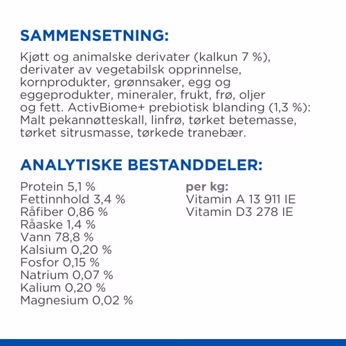 SAMMANSÄTTNING: Kött och animaliska derivat (kalkon 7%), derivat av vegetabiliskt ursprung, spannmål, grönsaker, ägg och äggderivat, mineraler, frukt, frön, oljor och fetter. ActivBiome+ prebiotisk blandning (1,3 %): Pekannötsskal, linfrön, torkad betmassa, torkad citrusmassa, torkade tranbär.