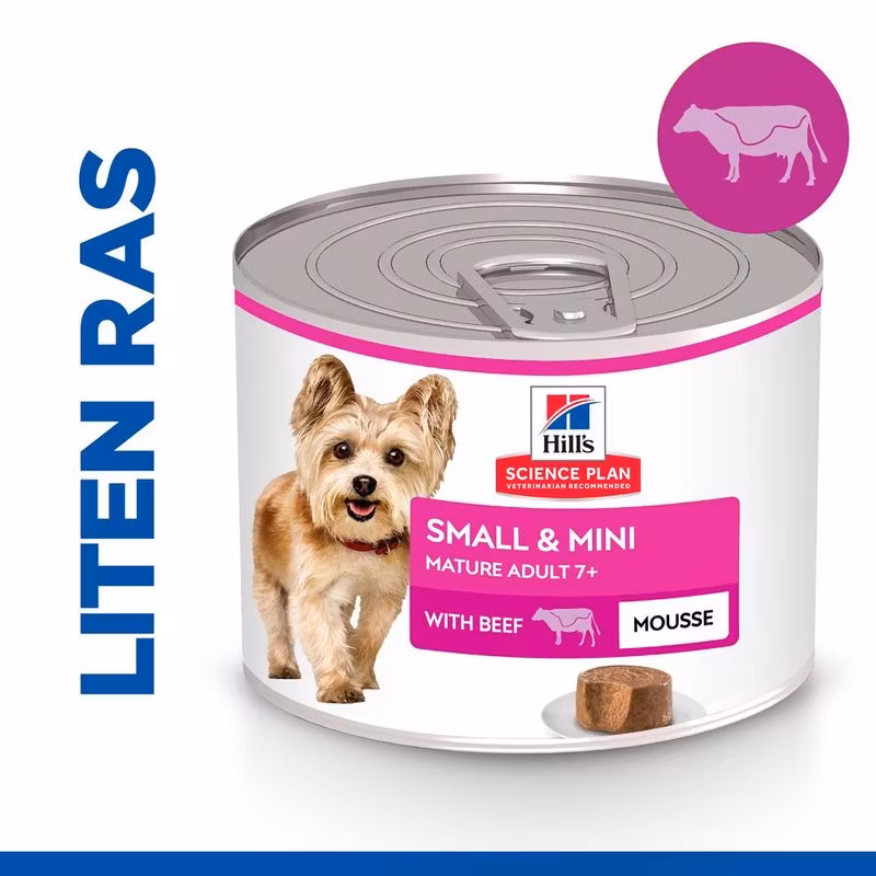 Hill's Science Plan Small & Mini Mature Adult Mousse med nötkött har en läcker, mjuk textur som passar för äldre små vuxna hundar, 7+ år gamla. En skräddarsydd näring för de speciella behoven hos din äldre hund och för att stödja ett värdigt åldrande
