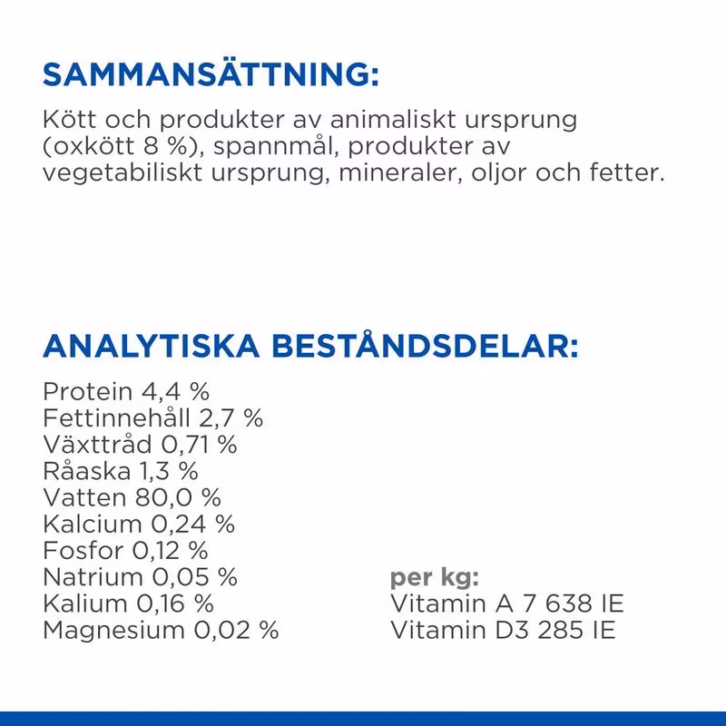 SAMMANSÄTTNING: Kött och animaliska biprodukter (nötkött 8%), spannmål, derivat av vegitabiliskt ursprung, mineraler, oljor och fetter.