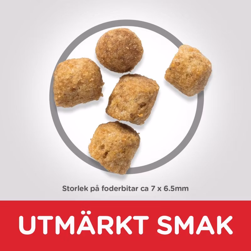 SAMMANSÄTTNING: Majs, kyckling- och kalkonmjöl (kyckling 15%; totalt fågel 23%), majsglutenmjöl, animaliskt fett, mineraler, fiskolja, hydrolysat.
