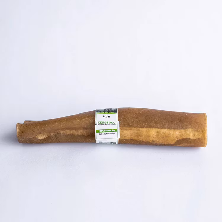 De här naturliga och hållbara tuggrullarna är gjorda av torkad råhud från älgar som lever i norrbottniska skogar, och är perfekta tuggben för hundar som älskar den naturliga smaken av älg. Du kan vara säker på att dina hundar inte tuggar på något som är blekt eller innehåller några som helst tillsatser, lim eller andra konstigheter. Med en längd på 25 cm och diameter på 3 x 4,5 cm är dessa tuggben passande för medelstora till stora hundar.