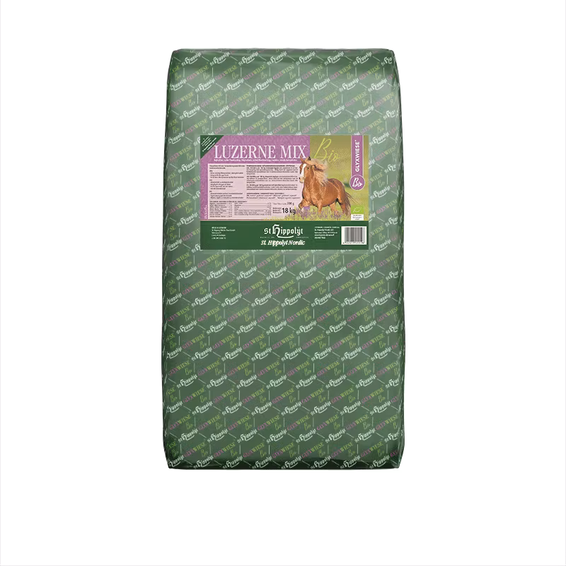 GlyxWiese® BIO Luzerne Mix är ett hygieniskt bearbetat grovfoder som med sin mycket stabila kvalitet gör den mycket användbar och praktisk i användning. Den är torkad genom en mycket skonsam torkprocess. Detta bevarar produktens naturliga näringsämnen till förmån för hästen. Produkten är hackad och ökar därigenom kompletteringsfodrets volym, förlänger tuggtiden och stimulerar hästens aptit.