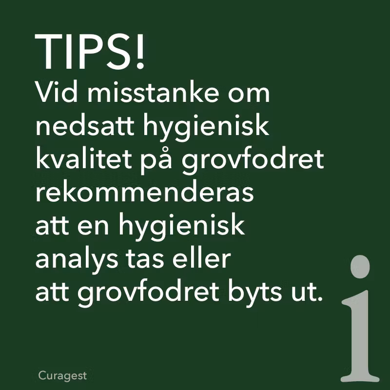 Vid misstanke om nedsatt hygienisk kvalitet på grovfodret rekommenderas att en hygienisk analys tas eller att grovfodret byts ut.