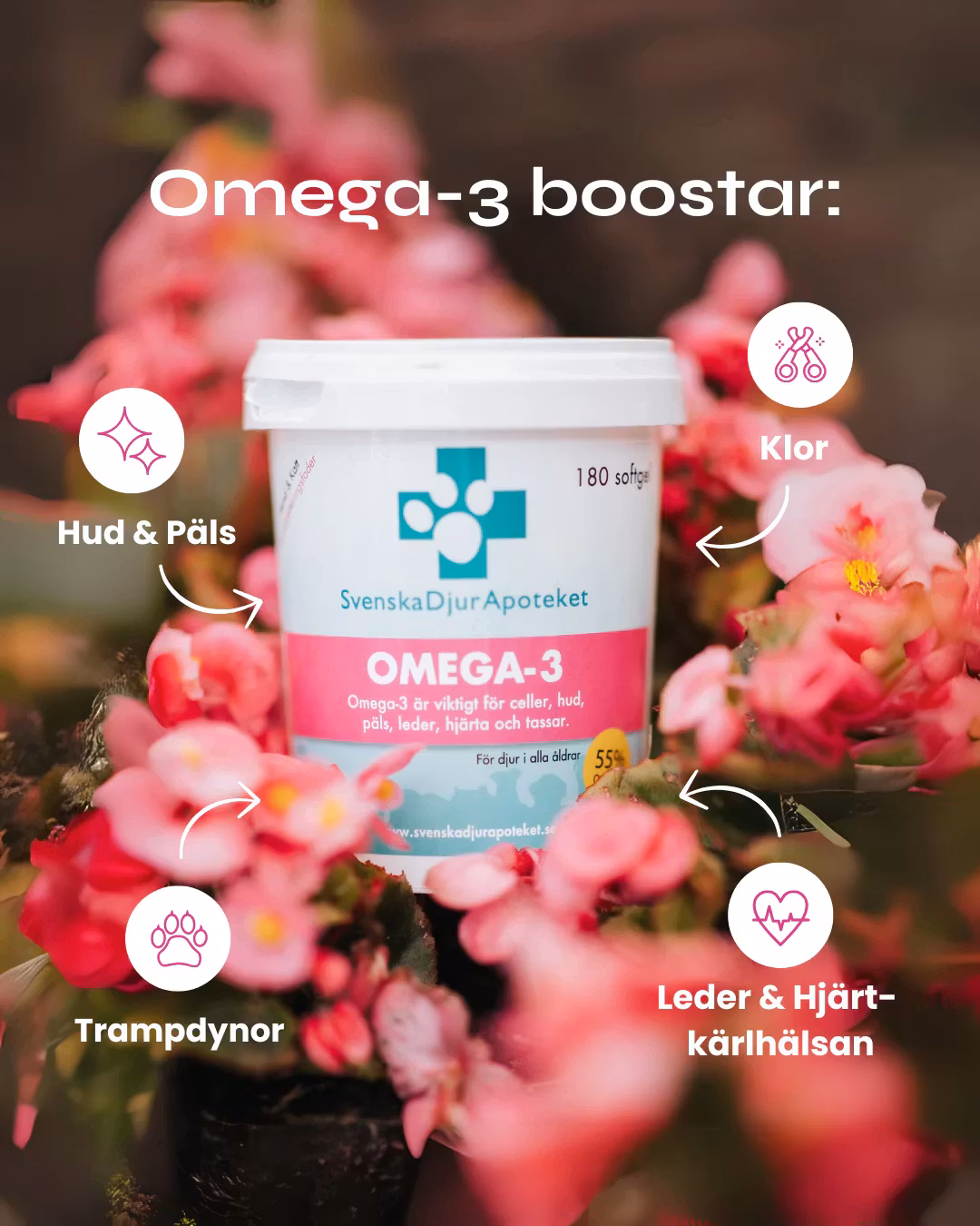 Svenska DjurApotekets Omega-3 med fettsyror från fisk (viltfångad anjovis och sardin) har en positiv effekt på huden, mag-tarmkanalen, njurfunktionen, synen, hjärt-kärlsystemet och rörligheten i lederna.