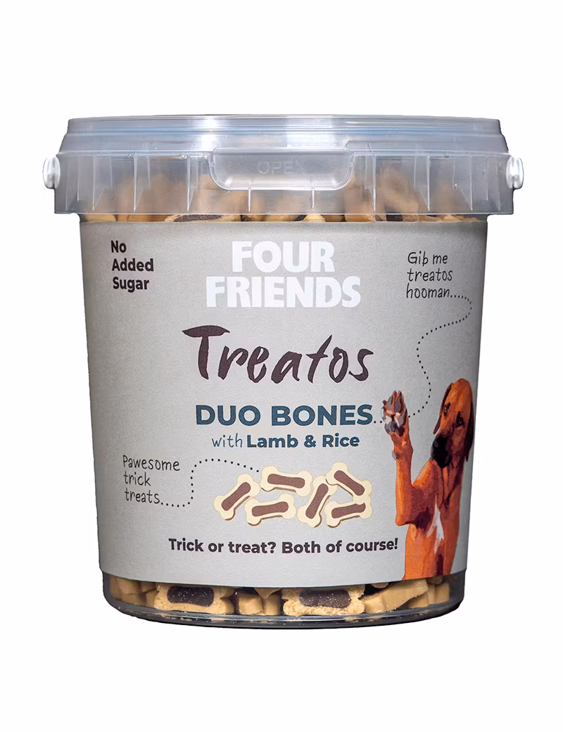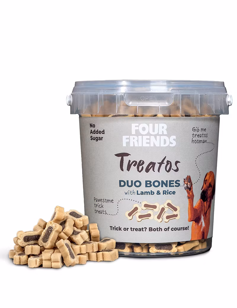 FourFriends Treatos hundgodis är ett prisvärt och semimjukt belöningsgodis i en behändig burk med handtag.