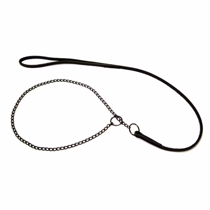 Ett sytt utställningskoppel i läder med påsydd svart kedja i olika längder