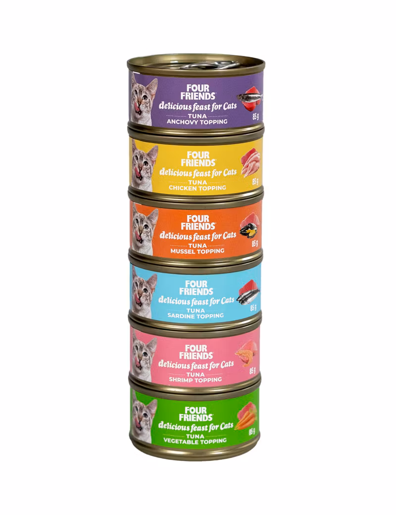 6-pack, en av var smak av FourFriends kattmatsburkar.