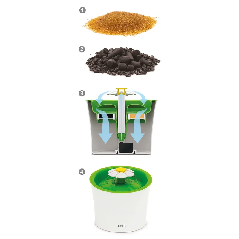 Vattenfontänen Catit Flower är perfekt för kattägare som inte vill fylla på vattenskålen varje dag. Med tre olika inställningar, ett mjukt vattenflöde, en bubblande topp eller lugnt rinnande, kan även de mest kräsna vattendrickarna bli nöjda. Fontänen är lätt att plocka isär och rengöra. Varje komponent kan rengöras med vatten och vanlig tvål.