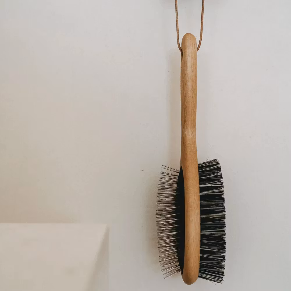 Vår dubbelsidiga hundborste är tillverkad i oljad bok och de två olika sidorna gör den perfekt för pälsvård. De rundade metallpiggarna glider lätt genom lång eller medellång päls. Den andra sidan med naturlig svinborst ger en silkeslen glans åt en kort eller medellång päls och reder ut tovor. Borsten vårdar inte bara pälsen och tar bort smuts, den har också en massageeffekt på huden och främjar därmed blodcirkulationen.