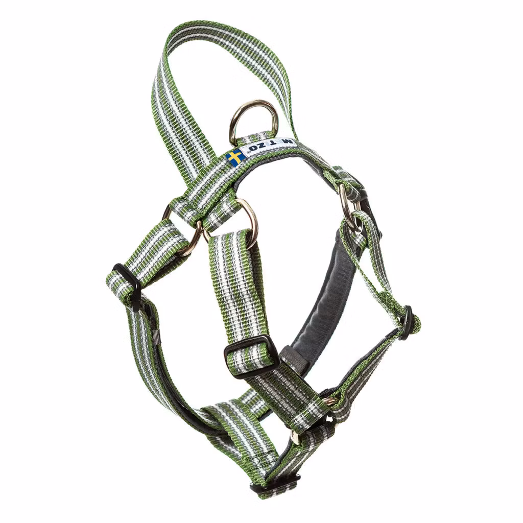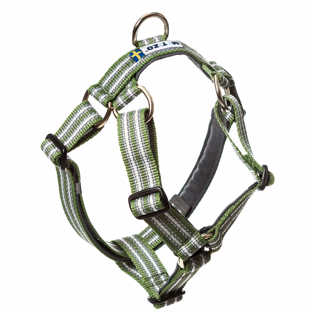Det finns två koppelfästen, det ena sitter uppe på ryggen, det andra fram på bröstbenet. Om man använder det främre koppelfästet så får inte hunden samma kraft att dra framåt, vilket kan leda till att hunden drar mindre i kopplet. Alternera med kopplet på höger respektive vänster sida under promenaden om det är kopplat på den främre ringen. Det är enkelt att byta koppelinfästning under promenaden.