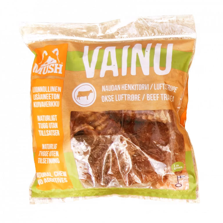 MUSH VAINU® Luftstrupe av nöt är det naturliga valet som godsak eller tidsfördriv för större hundar med kraftigare käkar. Njutningen kan ökas ytterligare och förlängas genom att till exempel fylla matstrupen med VAISTO-bullar eller något annat mjukt och ätbart.
