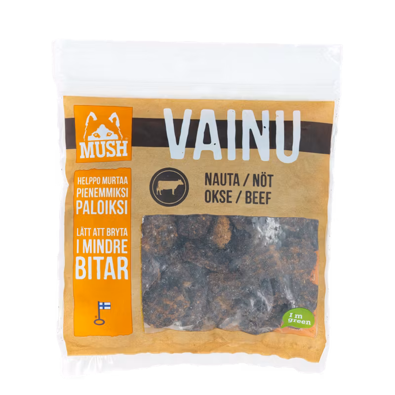 NYHET! Torkade, smakrika godisbitar av nötkött. Vainu Nötgodis innehåller 100 % finskt nötkött, inget annat. De spröda bitarna är enkla att bryta i mindre bitar och är smidiga att ha med sig i fickan. Godiset passar som träningsgodis, snacks eller mellanmål till både hundar och katter. Protein 48,3 %, fett 42,3 %.