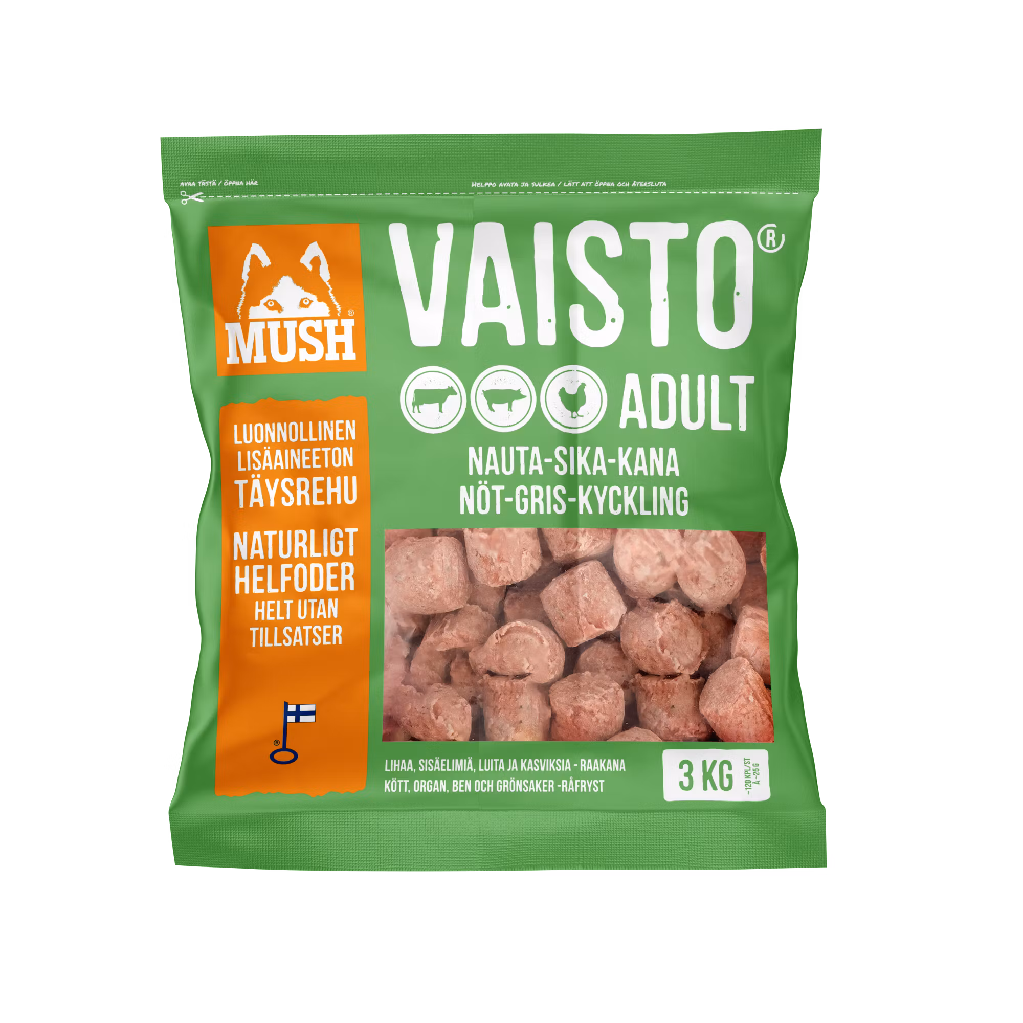 MUSH Vaisto Grön Freeze-dried (nöt-gris-kyckling) är ett skonsamt helfoder för vuxna hundar. Det innehåller den minsta andelen ben av alla Vaisto-produkter och lite mer nötvom, vilket gör att produkten även lämpar sig för hundar med känslig mage eller för hundar med en långsammare matsmältning.