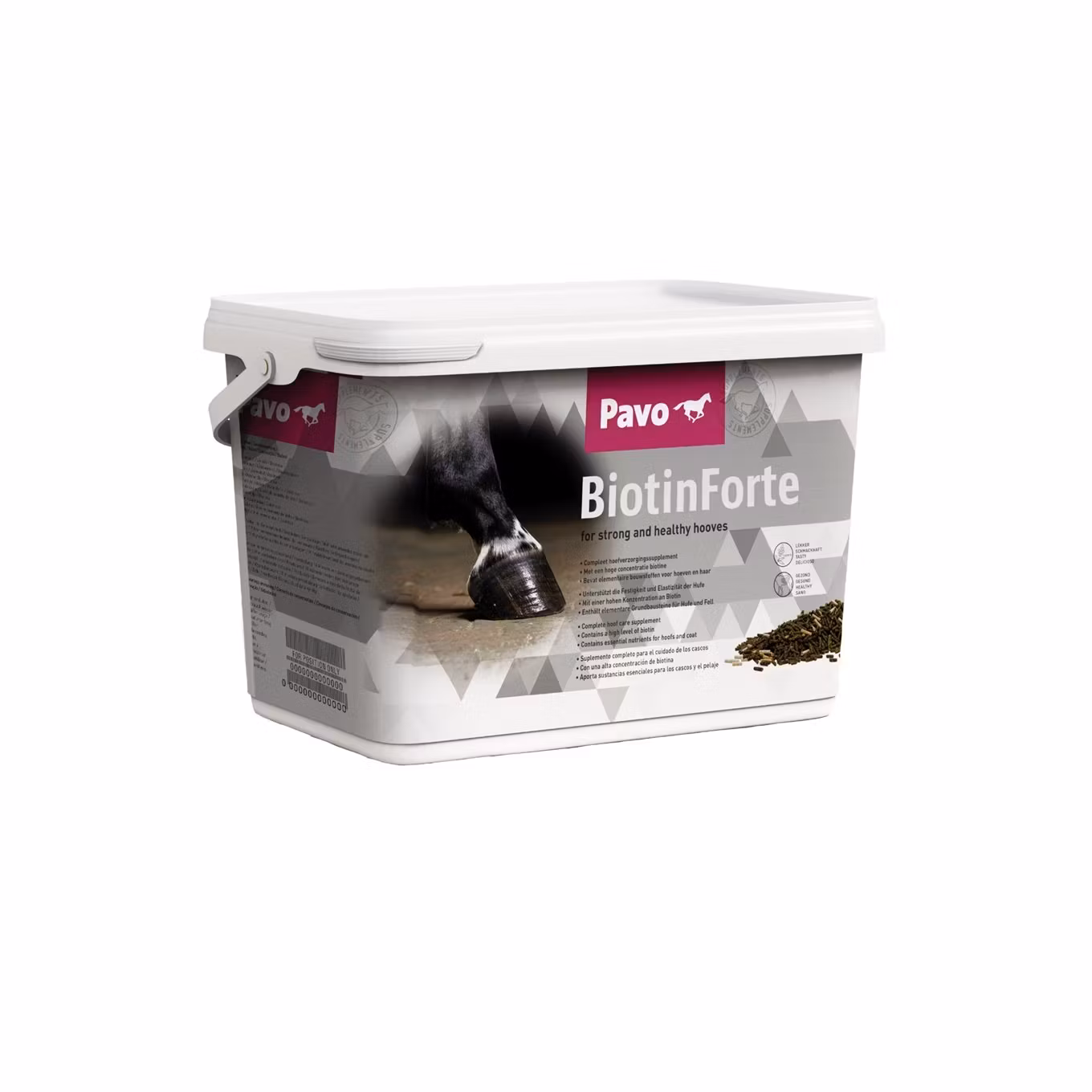 Pavo BiotinForte innehåller biotin (vitamin B8), koppar, zink och essentiella aminosyror för att stödja en optimal hornkvalitet. Forskning har visat att en riktig kombination av dessa ämnen är effektivare än bara en hög dos biotin. I Pavo BiotinForte är dessa förhållanden perfekt balanserade, så att du ger din häst optimalt stöd med bara en enda produkt. En extra fördel är den positiva effekten på pälsens kvalitet, eftersom håret är byggt av samma byggstenar som horn. Din hästs päls kommer att få en fantastisk glans. Vitamin B8 behövs för utveckling och underhåll av strukturer och bindväv i kroppen. Därför erbjuder Pavo BiotinForte också byggstenar för leder och artärer. Pavo BiotinForte innehåller inte vete, så detta tillskott passar även hästar som är känsliga för gluten. Pavo BiotinForte finns i en 3 kg hink med förslutningsbart lock