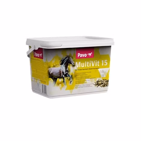 Mängden A-vitamin i Pavo Multivit15 har minskats, eftersom forskning har visat att detta ofta doseras för högt och att "ju högre desto bättre" inte gäller denna vitamin. Överdosering kan leda till problem. Pavo Multivit 15 är ett komplett vitamintillskott som stöttar hästens immunförsvar. Det bidrar till en glänsande päls och smidig fällning.