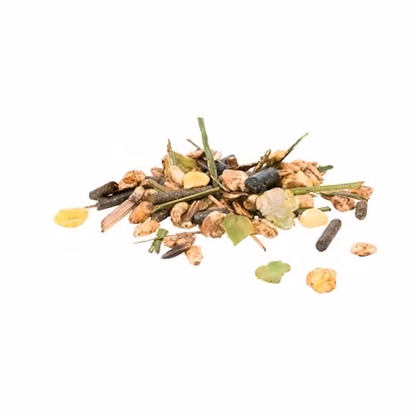 Lusern / Havre / Vetegryn / Speltveteskal / Poppat korn / Poppad majs / Soja(böns)mjöl, rostade non-GMO / Rörmelass / Sojabönor flingor nonGMO / Vete / Solrosfrömjöl / Sojaolja non-GMO / Korn / Linfrö / Majs (GMO) / Kalciumkarbonat / Ärt flingor / Natriumklorid / Magnesium oxid / Vetekli / Cikoriapressmassa / Öljäst / Linfröolja / CellProtect