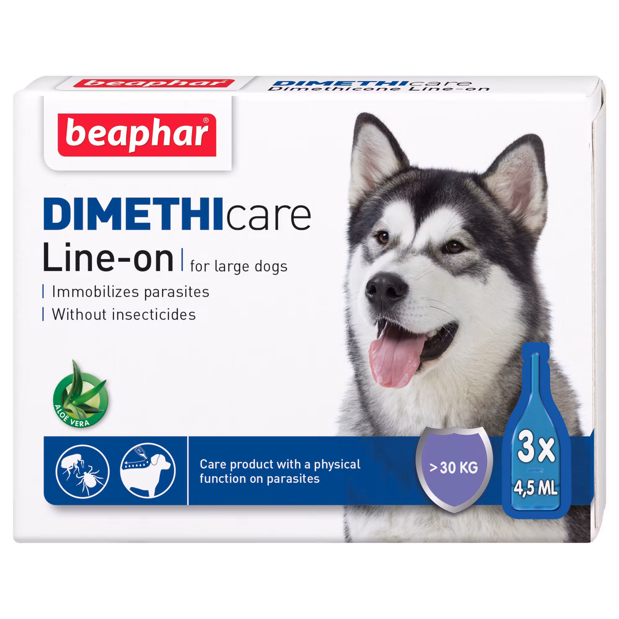 Beaphar Dimethicare Line-On är en vårdprodukt för hundar från minst 12 veckors ålder. Den stödjer upprätthållandet av en frisk hud och päls. Duo-komplexet med närande aloe vera och dimetikon immobiliserar fästingar, loppor och andra parasiter som myggor, kvalster och löss genom rent fysiska medel. Beaphar Dimethicare innehåller inga kemiska insektsmedel, utan silikoner (dimetikon) som bildar ett klibbigt lager runt fästingar, loppor, kvalster, etc. Som ett resultat blir de förlamade. Parasiterna faller av pälsen eller kan borstas bort. Innehållet i 1 pipett har en närande effekt på pälsen i cirka 8–10 dagar och pälsen blir inte klibbig. Dimetikon är effektivt i alla livsstadier hos loppor.