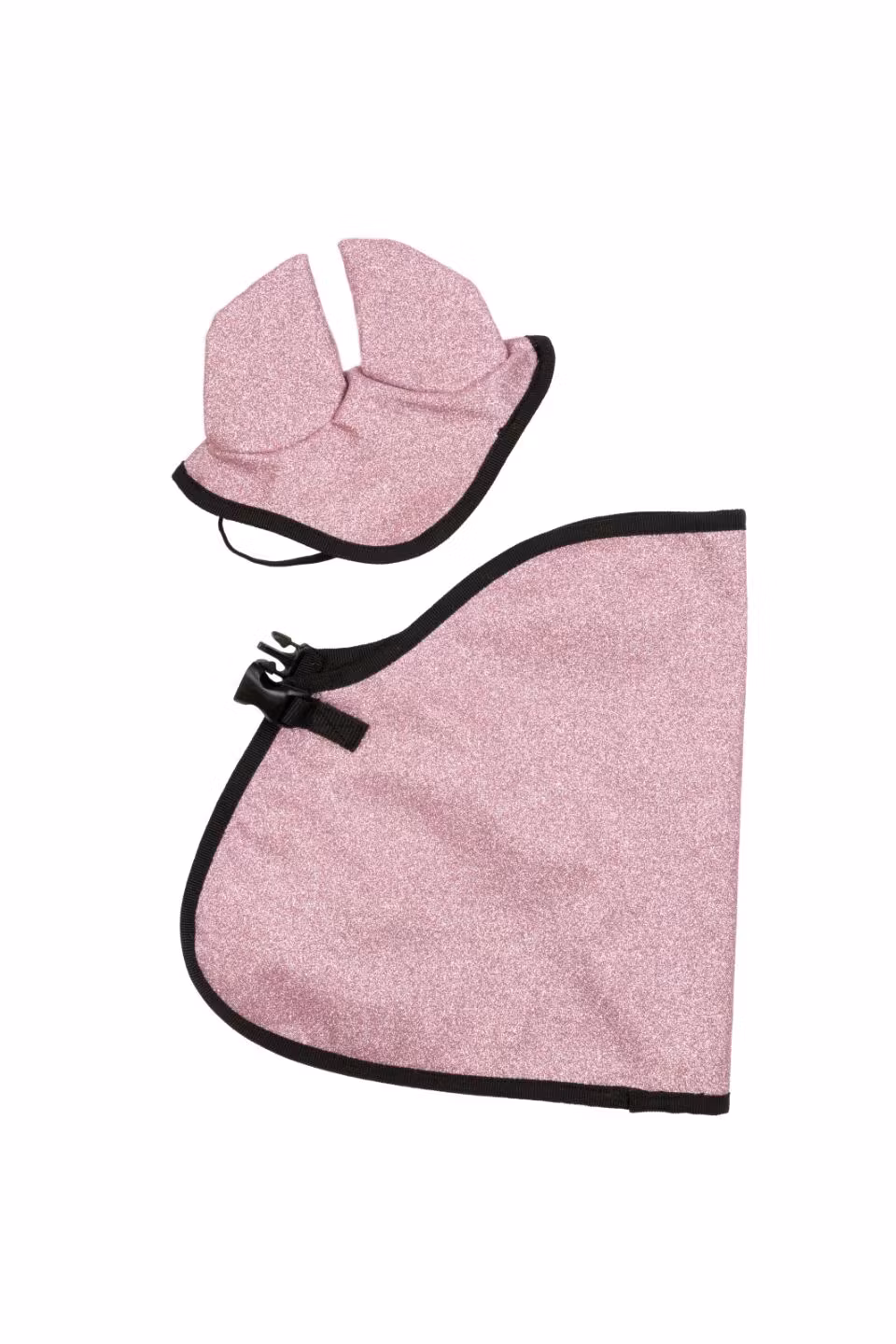 Setet är tillverkat i den vackraste glitterfärgen. Täcket är lätt att stänga/öppna med ett spänne. Huvan är också lätt att sätta på. Det lilla elastiska snöret säkerställer att huvan inte faller av under ridning.