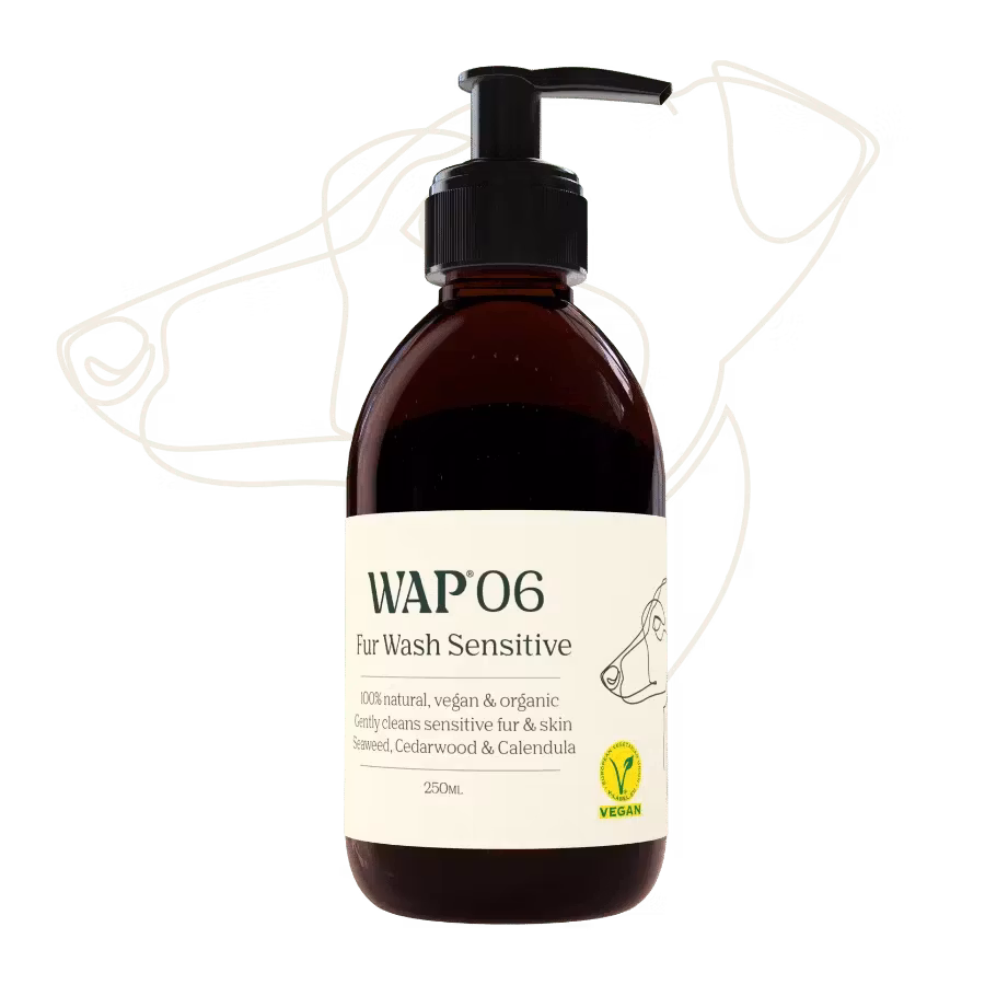 WAP:6 är ett hundschampo för känslig hud och skadad hud. Det är ett ekologiskt hundschampo som passar hundar med klåda och allergier. Kombinationen sjögräs, havreolja, ringblomma, kamomill och nyponfröolja lugnar irritationen i pälsen och återfuktar huden på djupet. Schampots återfuktande egenskaper motverkar mjäll och klåda i pälsen. Rekommenderas även till valpar, som naturligt har en känsligare hud.